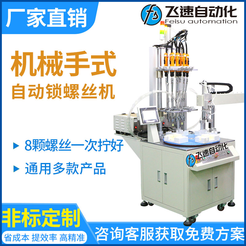 • 產品簡介: 本案例為轉盤機械手式自動擰螺絲設備,可以一次擰好產品上的8顆螺絲,并結合流水線生產。 飛速自動化廠家提供一臺轉盤機械手式自動擰螺絲機,通過配置轉臺和機械手臂,由設備一次擰好8顆螺絲,擰好螺絲的產品由機械手臂抓起并放入流水線,設備可實現多軸擰螺絲、取放產品 、送螺絲、員工放置工件等多工位同步圓周作業,生產效率極高。